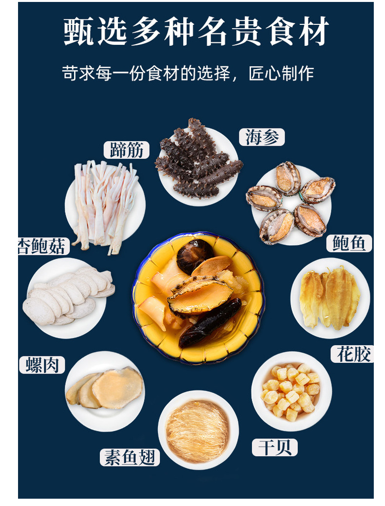原料与配料鲍鱼,海参,花胶,蹄筋,螺肉等