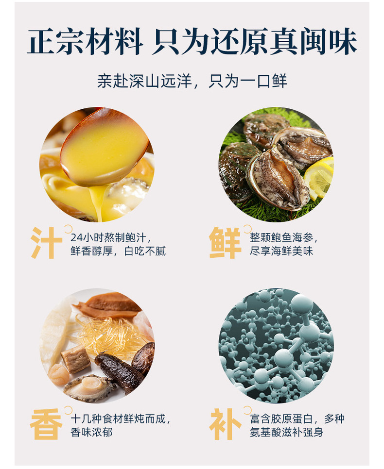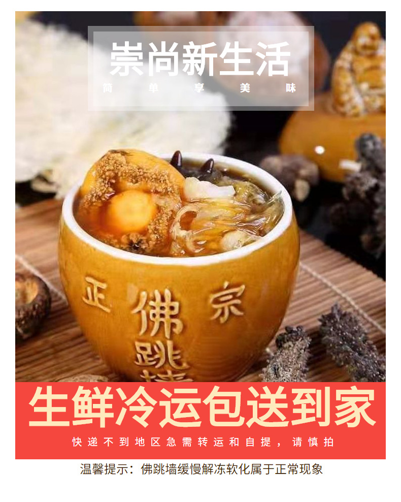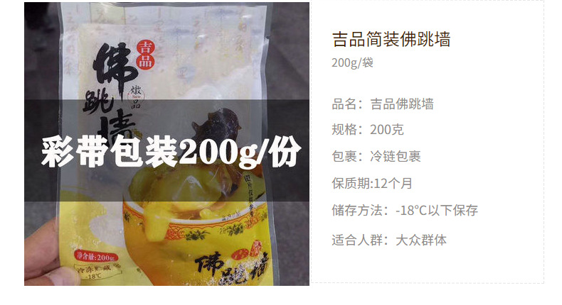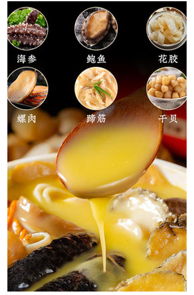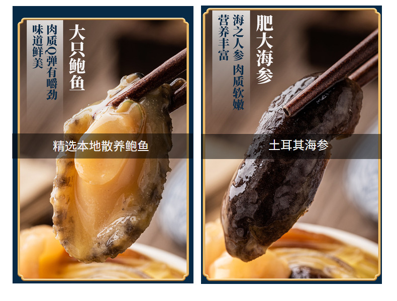包装规格【大团圆试吃款4包装】200g佛跳墙+220g小米海参+220g鲍鱼花胶鸡+220g鲍鱼扣掌各1包,【大团圆屯屯款8包装】200g佛跳墙+220g小米海参+220g鲍鱼花胶鸡+220g鲍鱼扣掌各2包