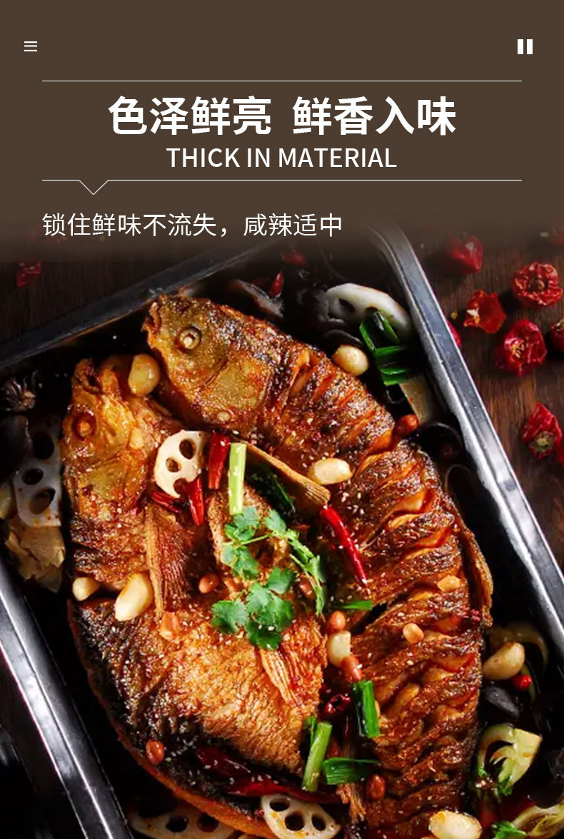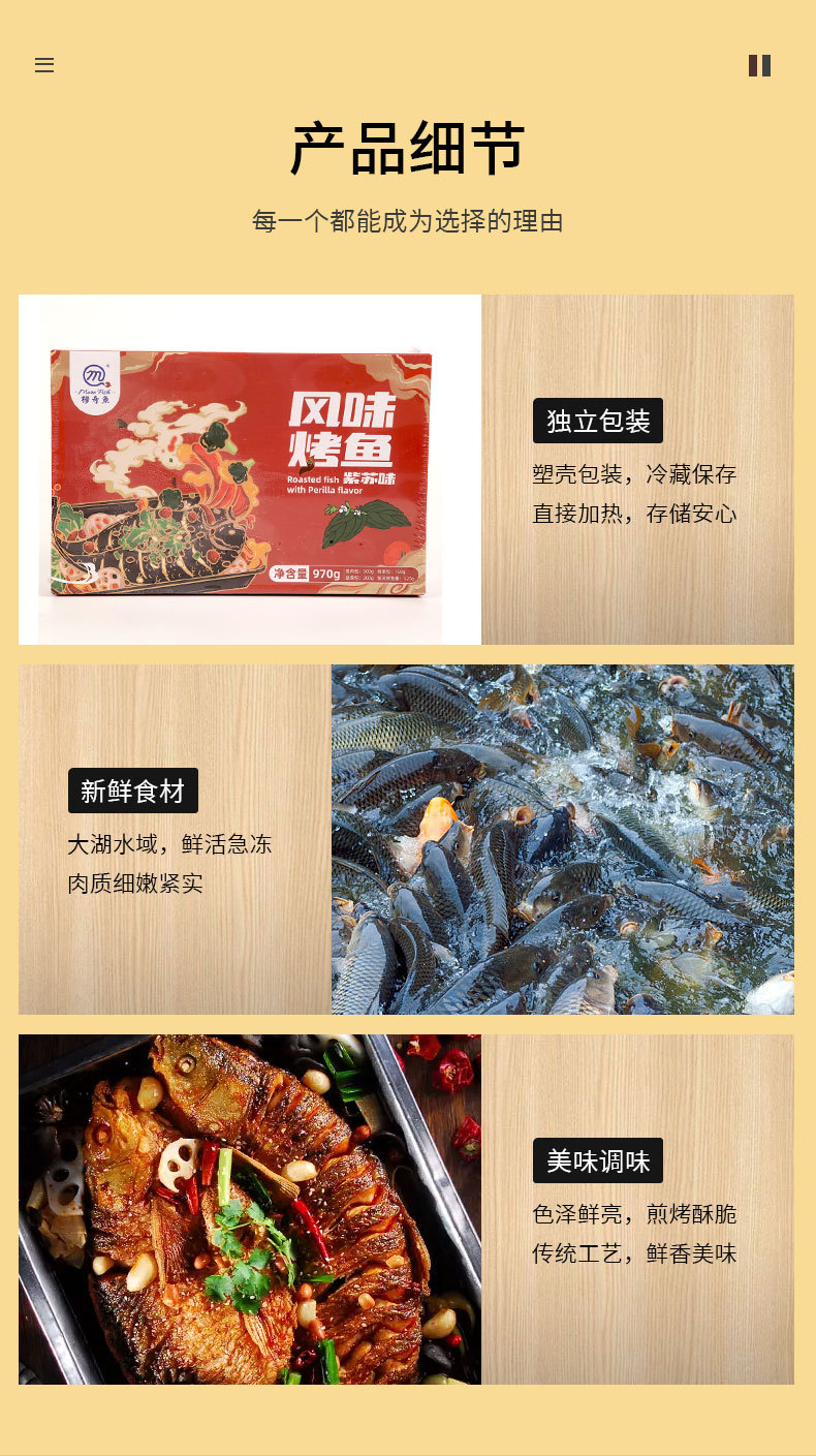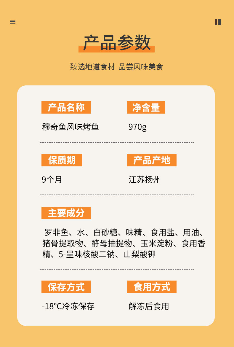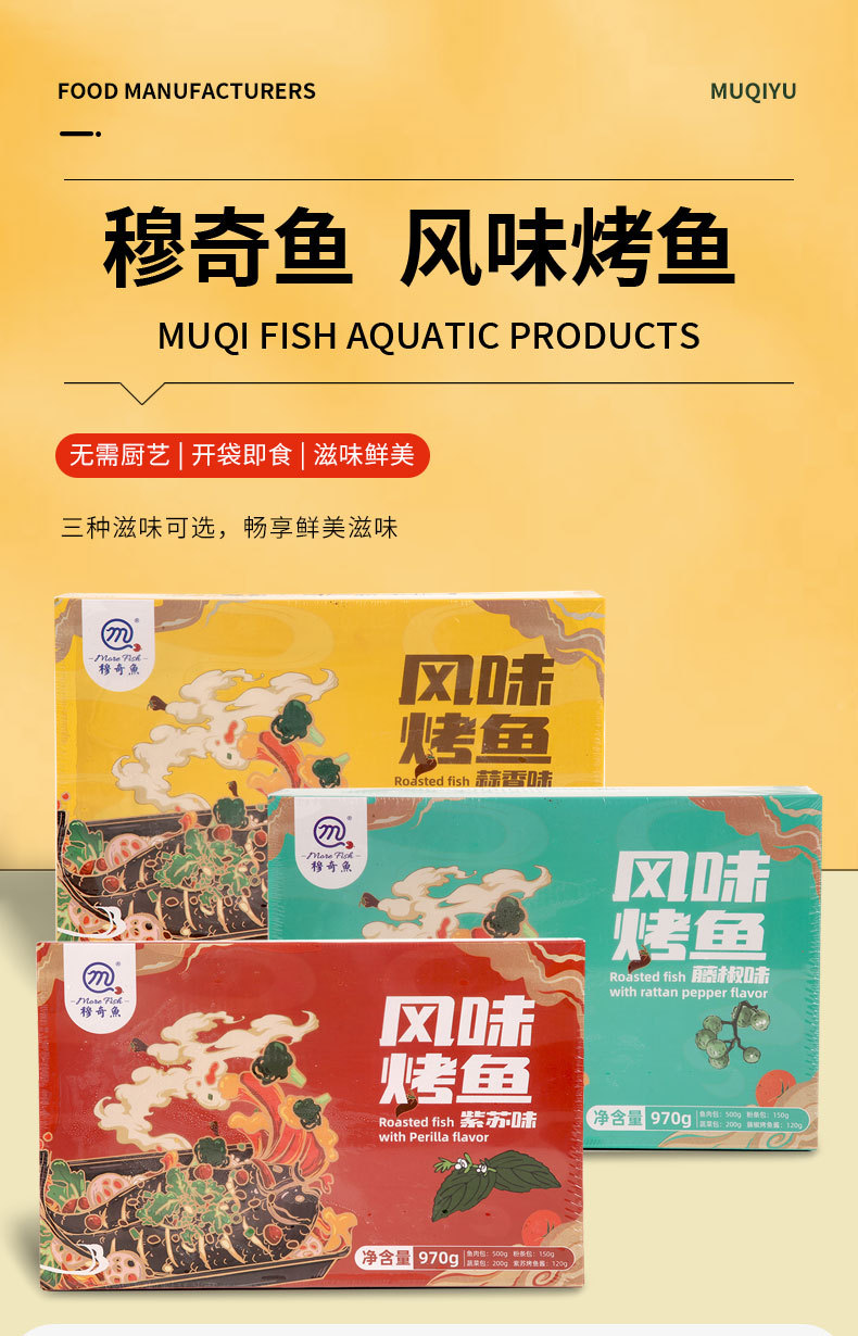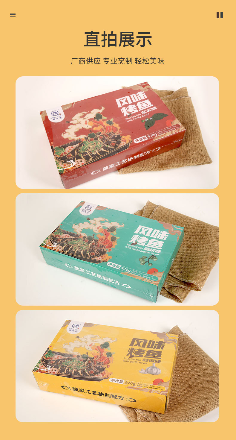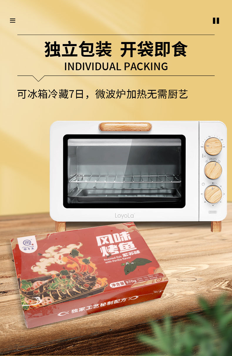 包装规格风味烤鱼(蒜香味)970g/盒,风味烤鱼(紫苏味)970g/盒,风味烤鱼(藤椒味)970g/盒